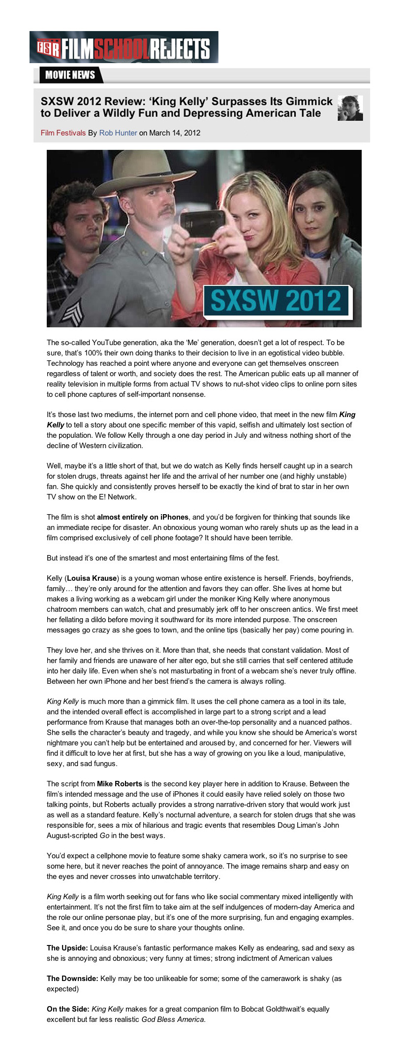 King Kelly is an aspiring internet star who performs webcam stripteases. When Kelly’s car – filled with illegal narcotics that she must deliver – is stolen by her bitter ex-boyfriend on the 4th of July, Kelly and her best friend Jordan embark on an epic whirlwind of drugs, sex, violence and mischief-making as Kelly tries to reclaim what’s hers. Kelly’s biggest online fan, a wayward State Trooper, joins the journey as the night spirals into chaos. Made entirely from camera-phone footage, King Kelly is a sensational journey through hedonistic American youth culture and the YouTube generation.